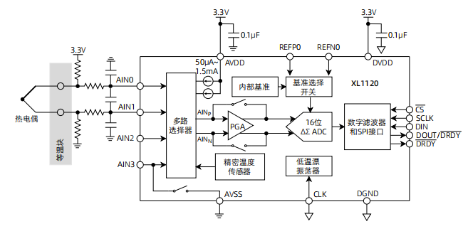 XL1120是一款精密、低功耗、兼容 SPI 接口、16 位 ΔΣ ADC, 其内部集成了一个低噪声可编程增益放大器 (PGA)、两个可编程 输出电流源 (IDAC)、一个电压基准、一个振荡器、一个低侧开关 和一个精密温度传感器。这些特性使得XL1120适用于测量微弱信号,例如电阻式温度检测器 (RTD)、热电偶、热敏电阻和桥特征式传感器。