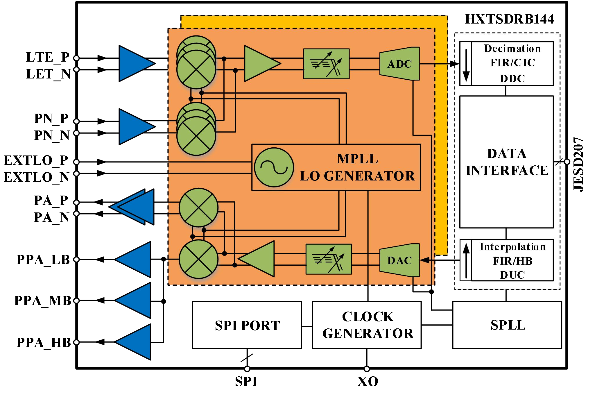● 芯片集成度高:接收通道自身具有优良的谐波抑制和带外抑制能力,适合强干扰环境应用,可支持无需片外SAW应用场景;发射通道在30MHz~1.5GHz频段内集成驱动放大器(DA)和功率放大器(PA),功率放大器输出可直连天线,适合低成本应用方案。