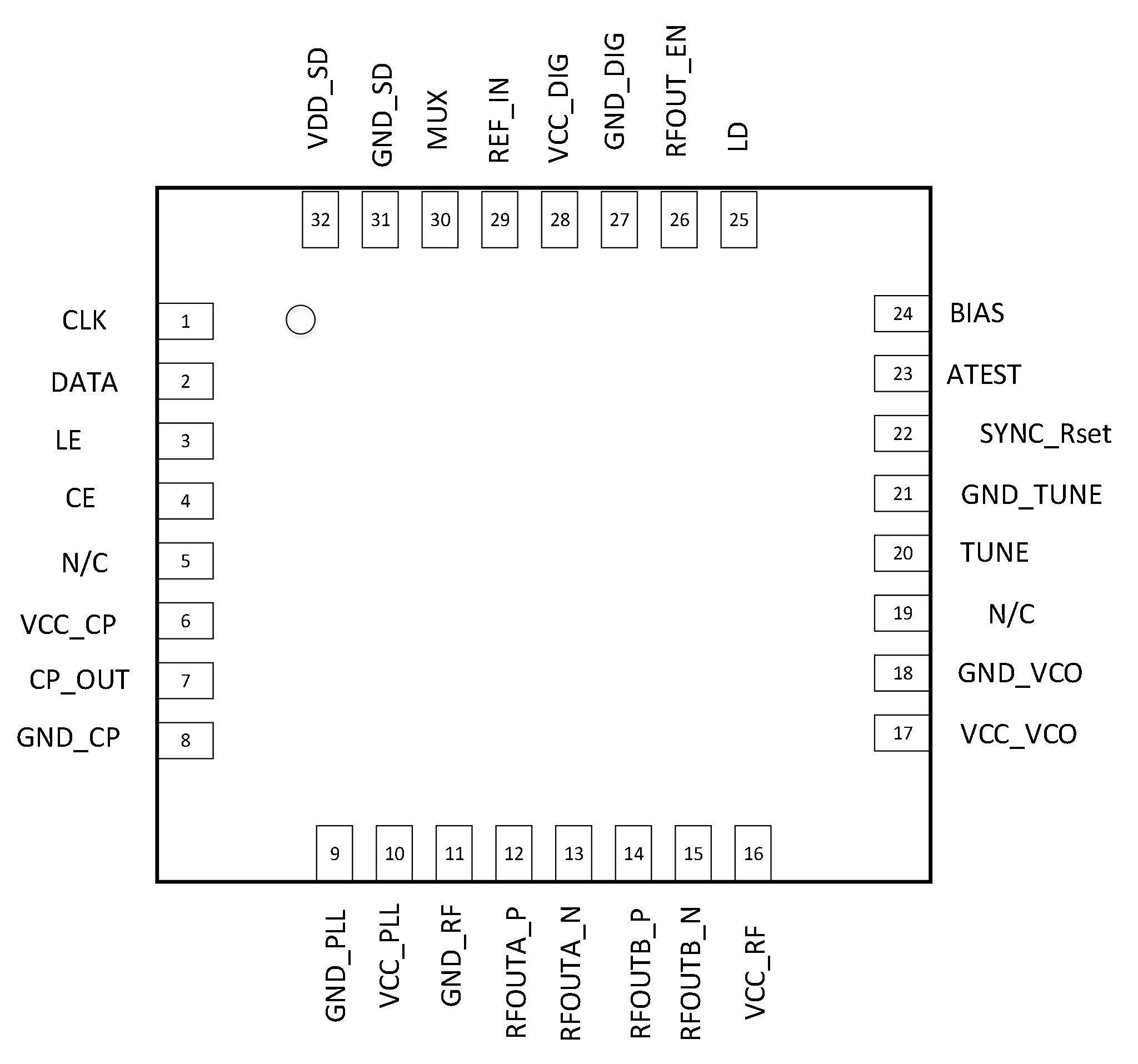 50~6000 | 200 | 600mW | -125dBc/Hz@1MHz | -74 dBc/Hz@10kHz | 3.3 | 180 | -40~85 | 32 TQFN-EP | PIN to PIN可替代ADF4350 |