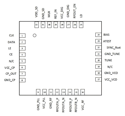 50~6000 | 200 | 600mW | -125dBc/Hz@1MHz | -74 dBc/Hz@10kHz | 3.3 | 180 | -40~85 | 32 TQFN-EP | PIN to PIN可替代MAX2871 |